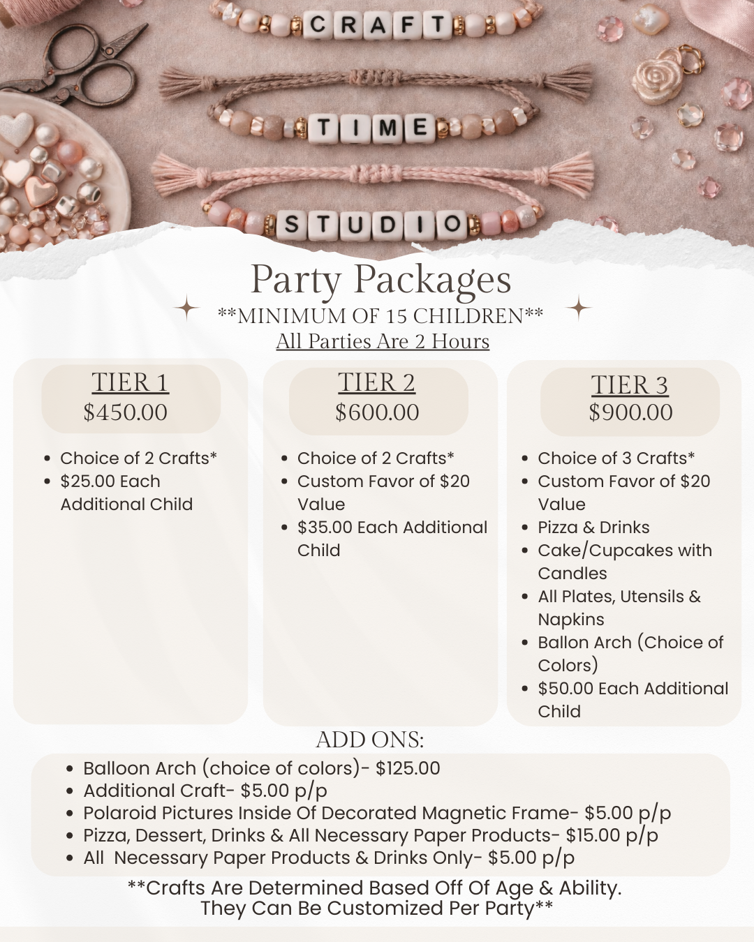Bring your party to life with endless craft options available. Inquire with our Customer Service Team today to find out more!